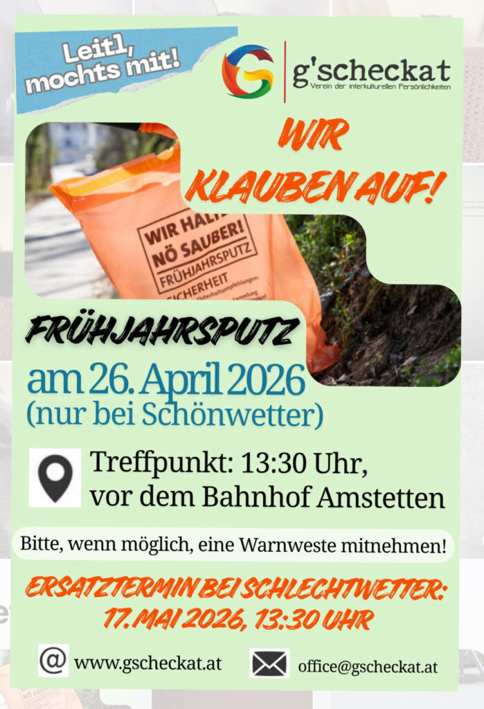 Home » Blog » Frühjahrsputz „Wir klauben auf“, 26. April 2026Frühjahrsputz „Wir klauben auf“, 26. April 2026von Team g'scheckat4. April 2026Allgemein, Information, Projekte Teilen:Click to share on Twitter (Opens in new window)Click to share on Facebook (Opens in new window)Click to share on WhatsApp (Opens in new window)Schlagwörter:Frühjahrsputz